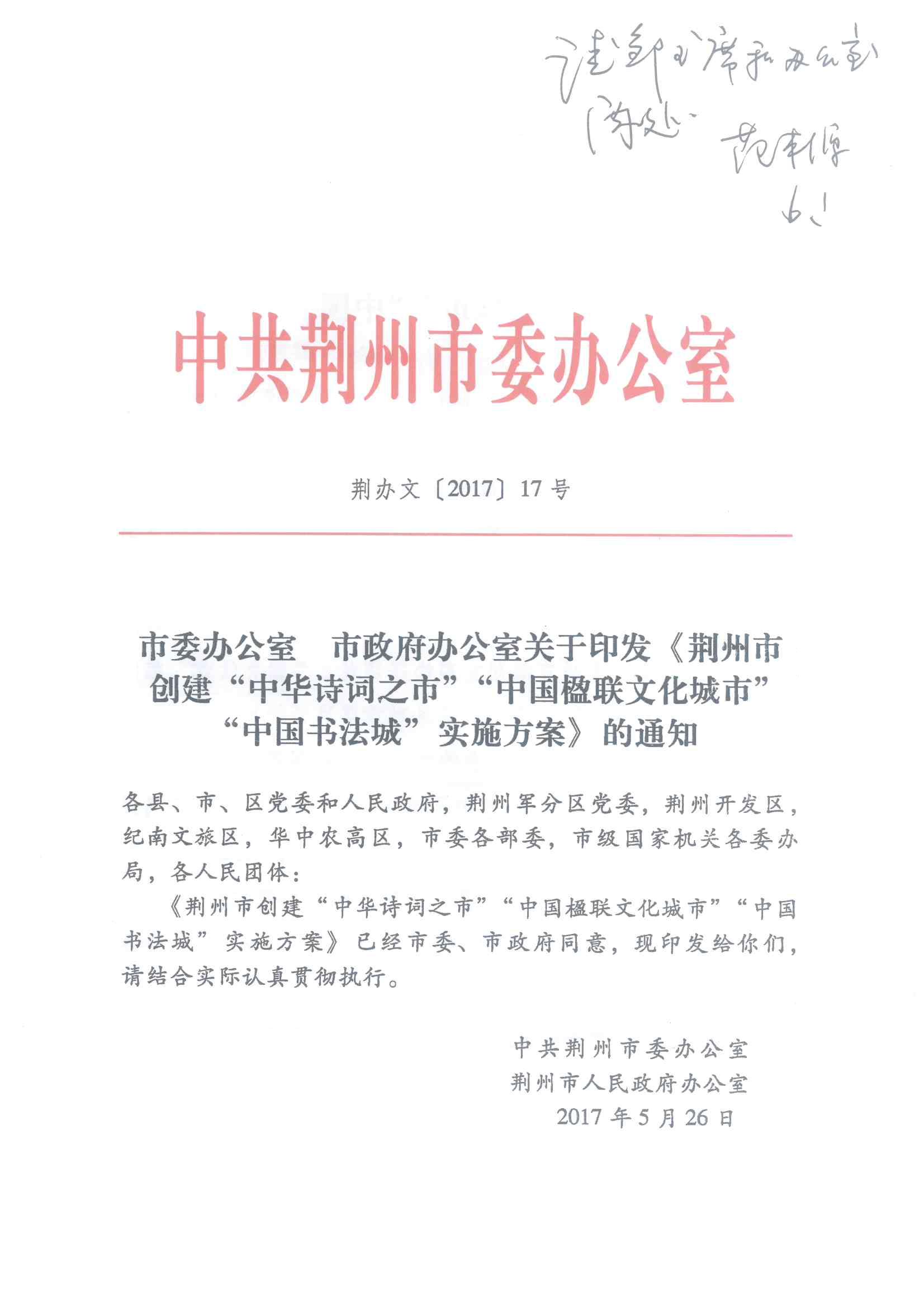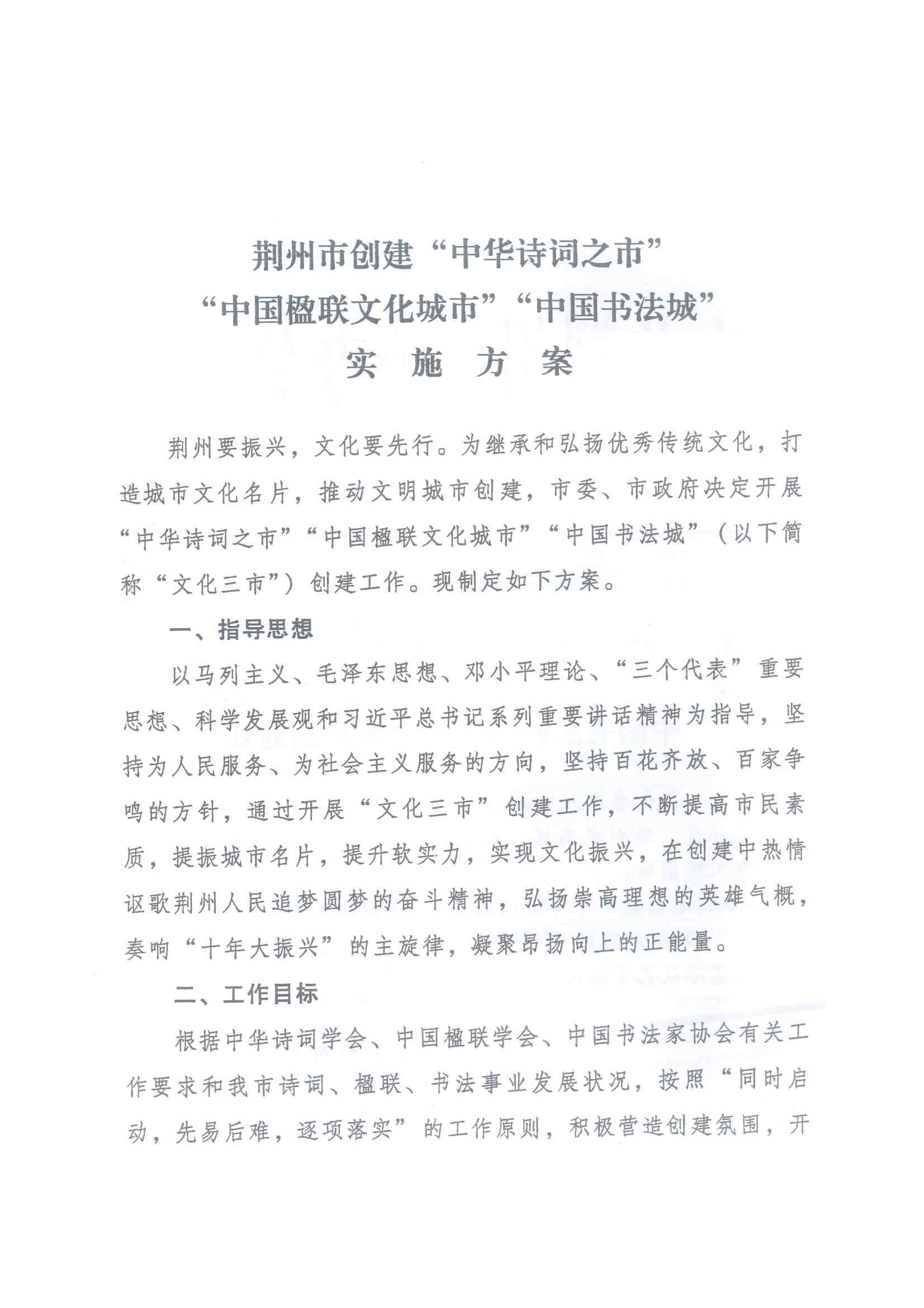 附件:市委办公室、市政府办公室关于印发《荆州市创建“中华诗词之市”、“中国楹联文化城市”、“中国书法城”实施方案》的通知