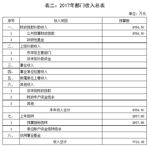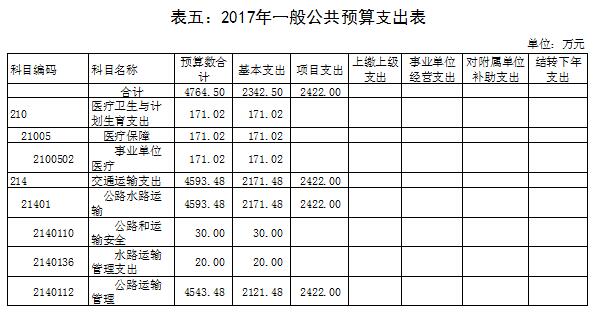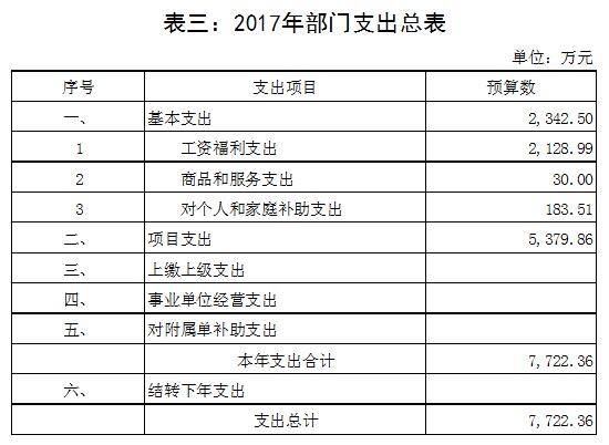 2017年一般公共预算支出4764.5万元,其中基本支出2342.5万元,项目支出2422万元。