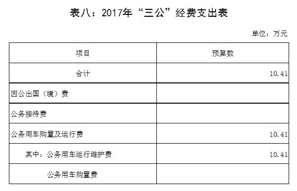 2017年三公经费预算安排支出10.41万元,较2016年减少65万元,主要是单位单位经费不够,人员经费都不能保障,故没有多余资金安排公用经费。