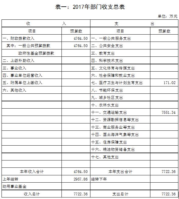 2017年预算收入4764.5万元,上年结转2957.86万元,收入总计7722.36万元。2017年预算支出7722.36万元,其中交通运输支出7551.31万元,医疗卫生与计划生育支出171.02万元。2016年部门预算收支总数为3304.42万元,2017年与2016年预算相比较预算增长4417.94万元,一是是2016年出租车燃油补贴资金2670万元结转到2017年发放,二是将以2014年至2016年发放燃油补贴资金平均数测算2017年燃油补贴资金2422万元编入2017年预算,因此形成较大差异。