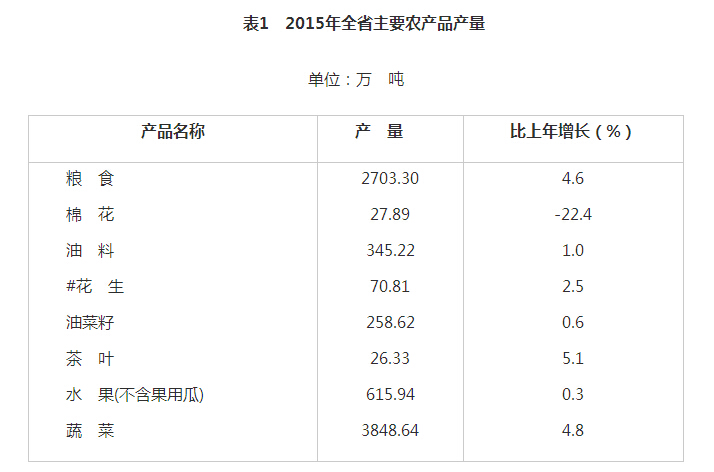 全年全省农林牧渔业增加值3417.42亿元,按可比价格计算,比上年增长5.2%。粮食种植面积4466.03千公顷,比上年增加95.69千公顷;棉花种植面积264.74千公顷,减少8.01千公顷;油料种植面积1545.52千公顷,增加3.01千公顷。粮食总产量2703.30万吨,比上年增产119.14万吨,增长4.6%,实现了历史性突破;棉花总产量27.89万吨,减产8.11万吨,下降22.4%;油料产量345.22万吨,增产3.41万吨,增长1.0%。