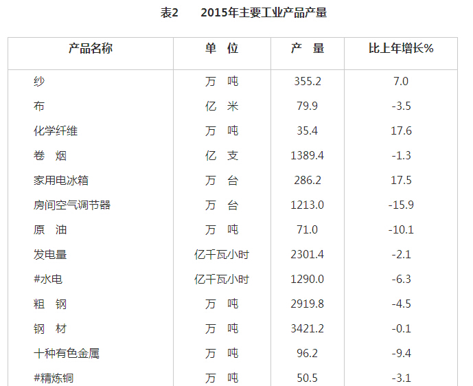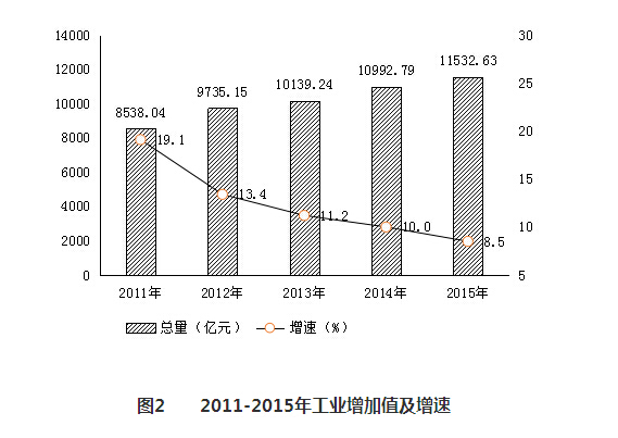 工业生产保持稳定增长。全省全部工业增加值11532.63亿元,增长8.5%。年末全省规模以上工业企业达到15894家,比上年净增1052家,增长7.1%。规上工业增加值增长8.6%。其中:国有及国有控股企业增长3.7%;集体企业增长1.2%;股份合作企业增长2.4%;外商及港澳台投资企业增长7.1%;其他经济类型企业增长8.3%。轻工业增长9.8%;重工业增长7.8%。
