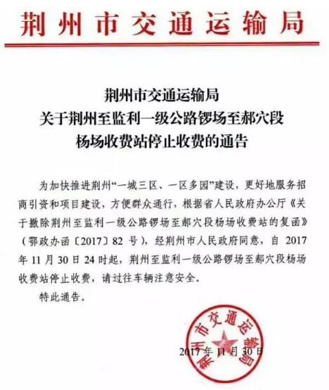 为加快推进荆州“一城三区、一区多园”建设,更好地服务招商引资和项目建设,方便群众通行,根据省人民政府办公厅《关于撤除荆州至监利一级公路锣场至郝穴段杨场收费站的复函》(鄂政办函[2017]82号),经荆州市人民政府同意,自2017年11月30日24时起,荆州至监利一级公路锣场至郝穴段杨场收费站停止收费,请过往车辆注意安全。